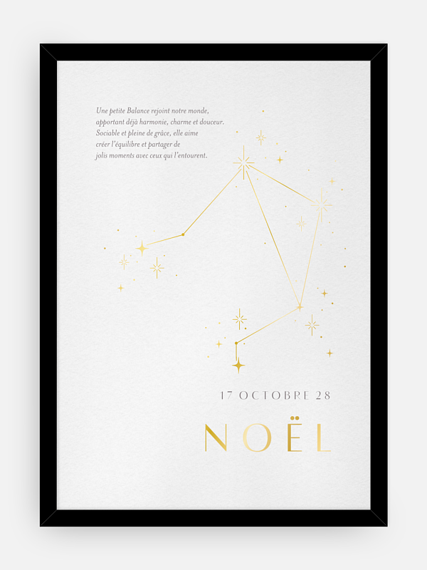 Le poster de naissance "Constellation de la Balance" apporte une touche d’harmonie et de légèreté dans la chambre de votre enfant. Il rappelle combien l’équilibre et les petits gestes remplis d’amour rendent la vie plus belle. Un cadeau de naissance attentionné, qui accompagnera parents et enfant pendant longtemps. Imprimé avec soin sur un papier de qualité – livré rapidement chez vous.