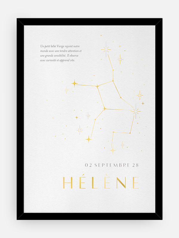 Le poster de naissance "Constellation de la Vierge" dégage une douce impression de calme et d’attention. Il évoque avec tendresse les tout premiers instants partagés avec votre enfant. Une jolie présence pour la chambre et une belle idée de cadeau de naissance, pleine de sens. Imprimé avec soin et pensé avec cœur – pour accompagner vos souvenirs les plus précieux.