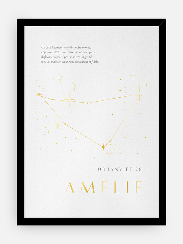 Le poster de naissance "Constellation du Capricorne" évoque la force tranquille, la persévérance et une douce sensation de sécurité. Il symbolise les tout premiers pas dans la vie – discrets, mais remplis de sens. Un joli présent à offrir ou à afficher dans la chambre de votre enfant. Créé avec beaucoup d’amour et imprimé sur un papier de qualité.