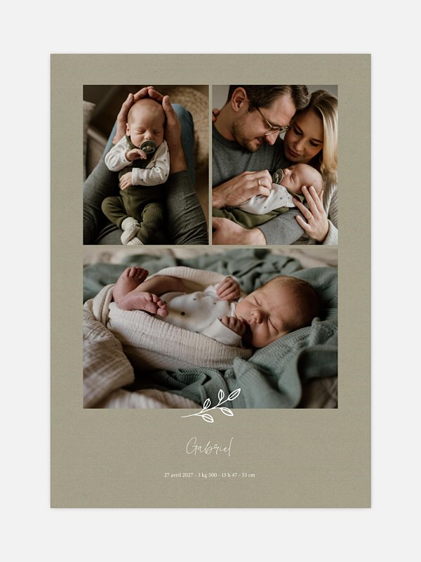 Une jolie carte naissance à personnaliser avec les photos de votre bébé. Doux et classique, le faire-part de naissance "Feuille dorée" vous enchantera.