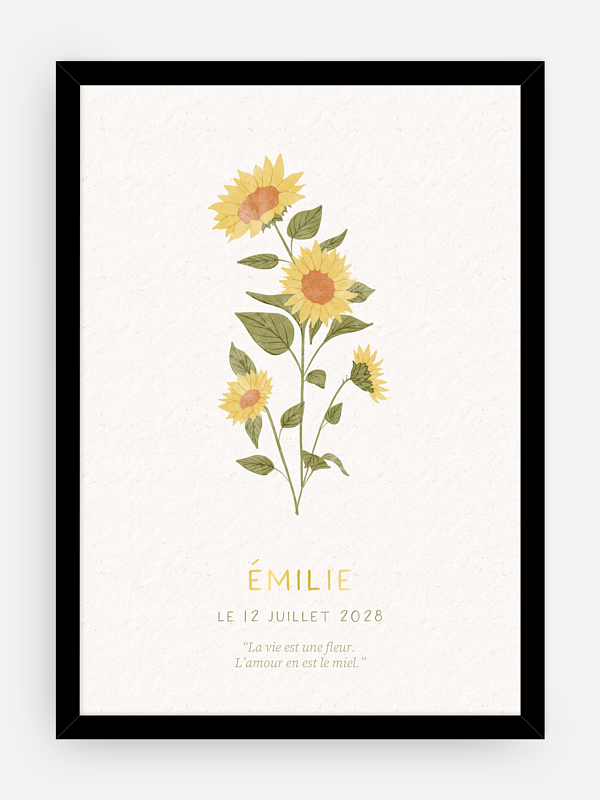 Le poster "Fleur de naissance - juillet" rayonne autour du tournesol, fleur du mois de juillet et symbole de chaleur, de vitalité et de joie partagée. Comme un petit soleil, il rappelle la lumière qu’un enfant apporte dès son arrivée. Ce poster capture avec tendresse l’énergie lumineuse d’un jour si spécial.