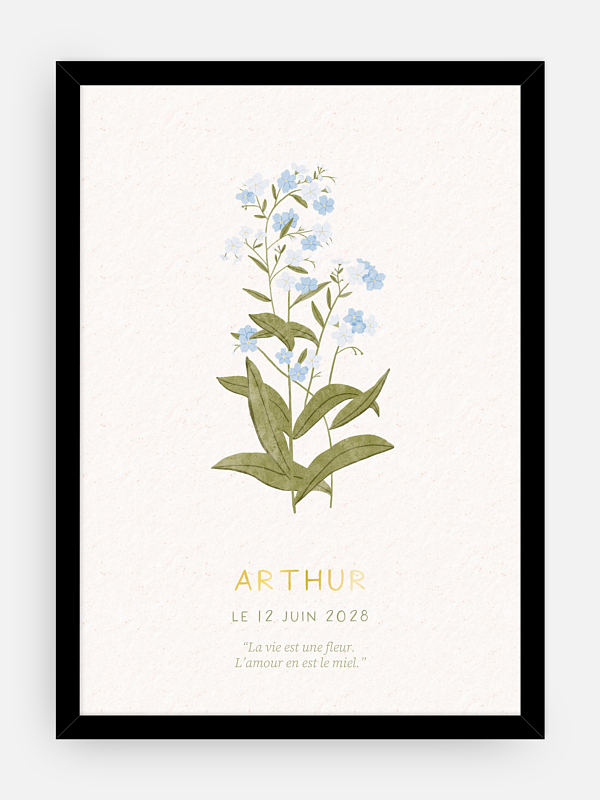 Le poster "Fleur de naissance - juin" met en lumière le myosotis, fleur discrète et touchante du mois de juin, symbole de souvenirs tendres et de liens profonds. Elle murmure tout en douceur que certaines rencontres marquent pour toujours. Une manière délicate d’honorer une naissance et d’en garder la trace avec émotion.