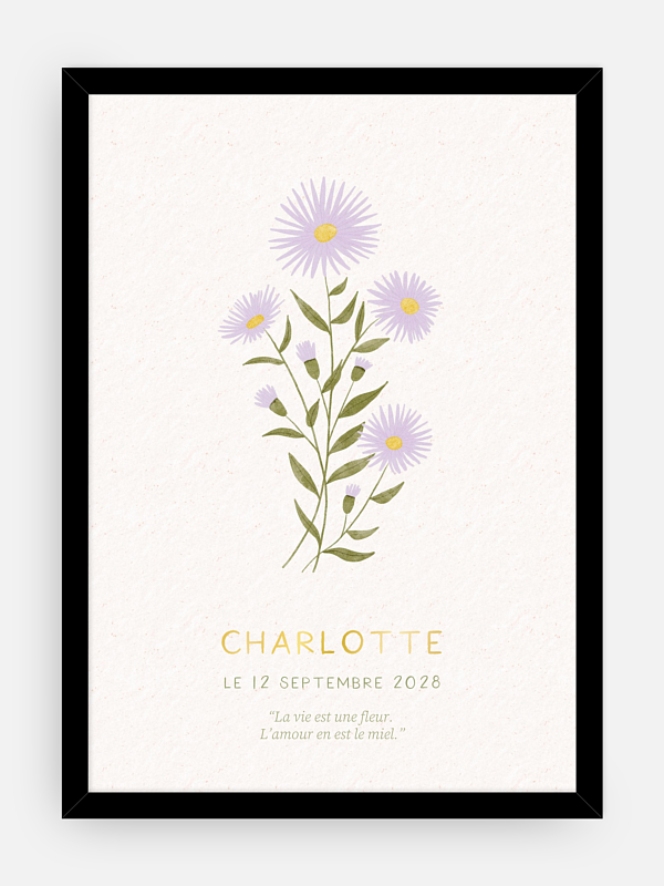 Le poster "Fleur de naissance - septembre" célèbre l’aster, fleur du mois de septembre, porteuse de confiance et de tendresse. Avec ses pétales délicats, elle évoque les liens qui se tissent dès le premier jour et la douceur d’un nouveau chapitre. Une attention pleine de sens pour marquer une naissance avec cœur.