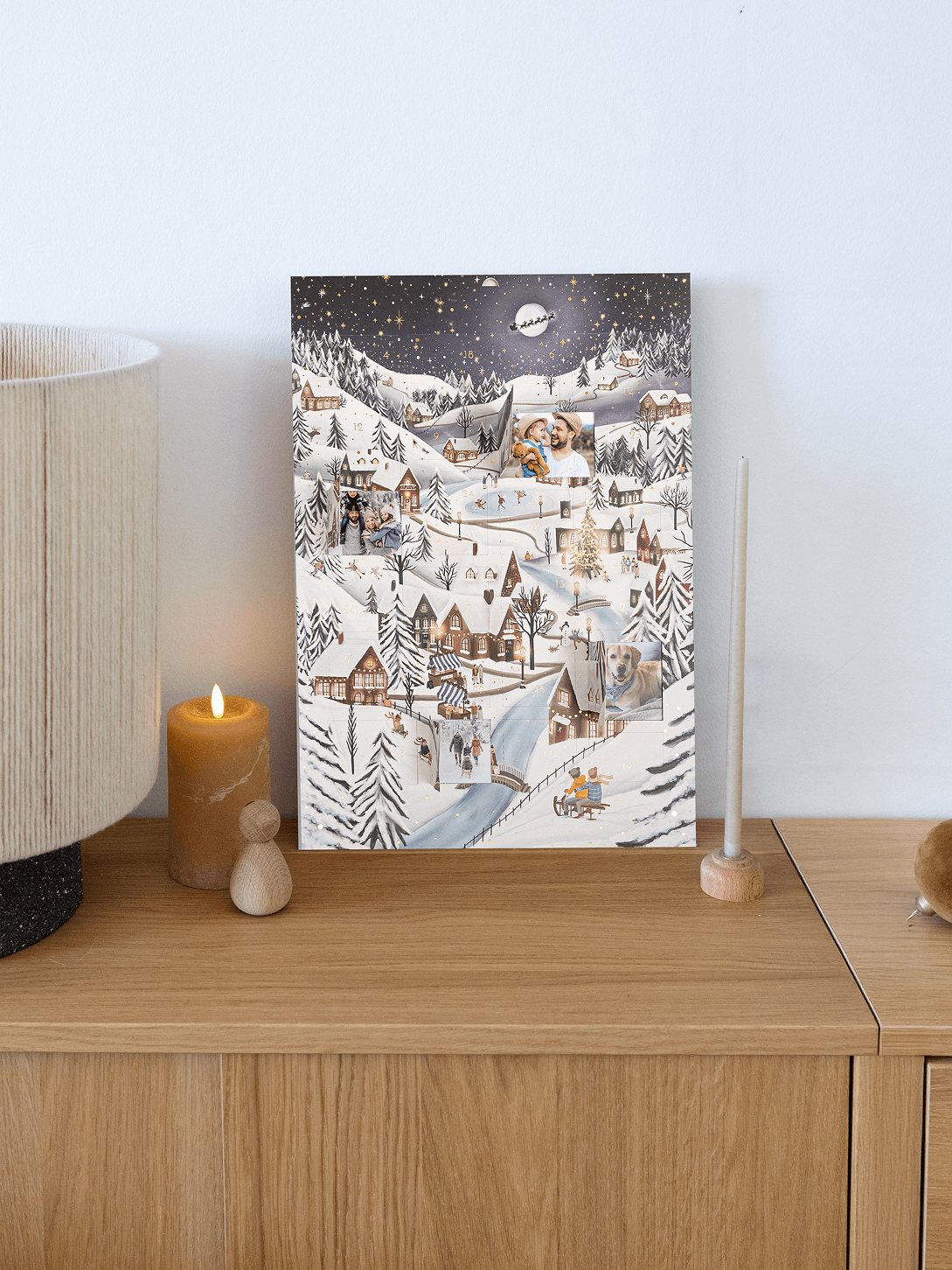Avec notre calendrier de l'Avent "Joie d'hiver", le temps de l'Avent devient un voyage de découverte quotidien pour toute la famille. Son paysage hivernal, dessiné à la main avec amour, est une véritable invitation au rêve et cache derrière chaque petite porte tes photos préférées de l'année. De délicats détails dorés scintillent à la lumière, faisant de ce calendrier un trésor unique qui embellit l'attente de Noël. Personnalise dès maintenant ce calendrier de l'Avent en ligne et partage chaque jour une petite touche de bonheur.