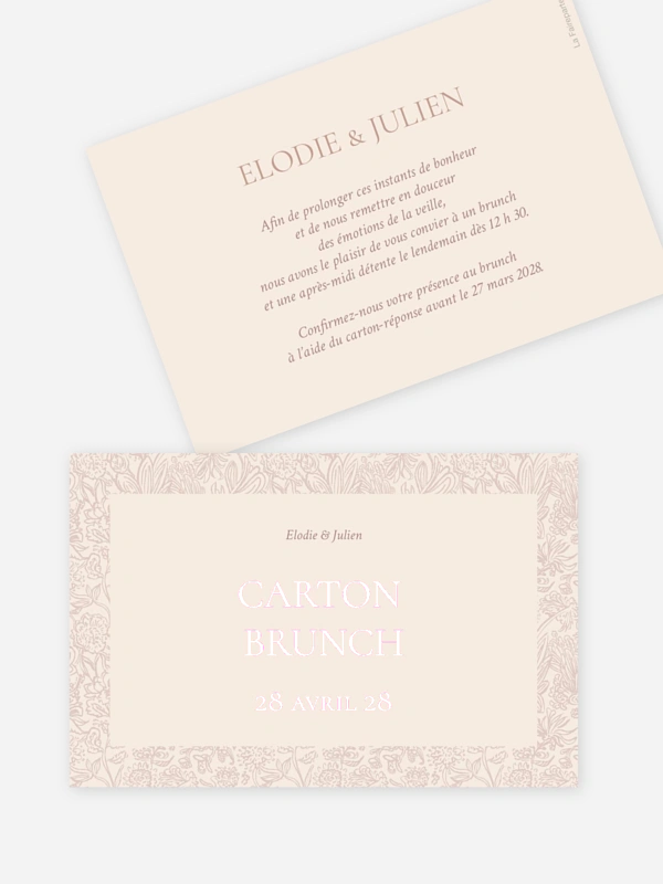 La carte brunch “Histoire d’amour” est à glisser dans votre faire-part mariage et vous permet d’inviter vos proches au brunch des mariés, le lendemain du mariage.