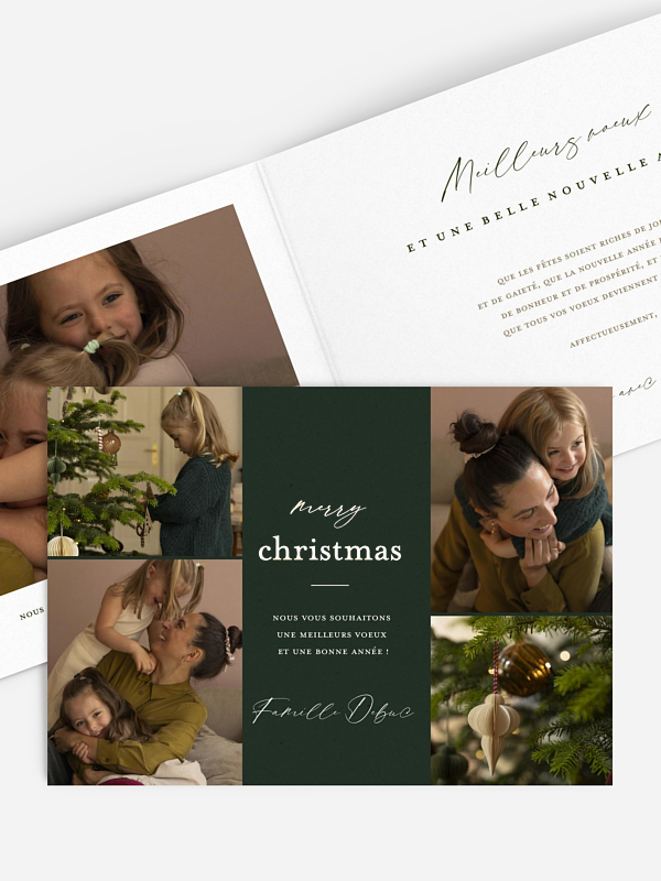 Racontez votre année en images avec une carte de Noël aussi chic que chaleureuse. Notre design "Scintillement magique" vous offre une jolie mosaïque pour assembler vos plus beaux moments et partager vos vœux. C'est une façon élégante et personnelle de souhaiter de joyeuses fêtes à tous ceux qui vous sont chers.