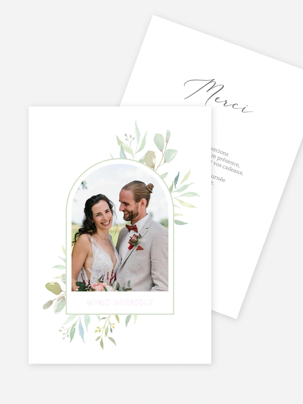 Célébrez la fin de votre grand jour avec la carte de remerciement "Bouquet d’amour", dont le design en arche entouré de feuillage aquarelle apporte une note de fraîcheur et de poésie. Ce modèle délicat est idéal pour mettre en lumière votre photo favorite et adresser un message plein de tendresse à tous ceux qui ont partagé votre bonheur. Pour garantir un rendu à la hauteur de vos émotions, nous assurons une impression de haute qualité sur des papiers haut de gamme rigoureusement sélectionnés. Profitez de notre service de création simple et intuitif pour personnaliser votre envoi en quelques clics seulement. Créez votre lot de cartes en ligne dès maintenant pour offrir un souvenir mémorable à vos invités.