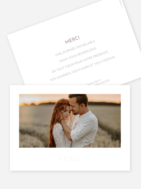 Prolongez la magie de votre grand jour en exprimant votre gratitude avec notre carte de remerciements de mariage "Cœur reconnaissant". Ce design épuré place votre photo préférée au centre de toutes les attentions pour partager une dernière note de tendresse avec vos invités.