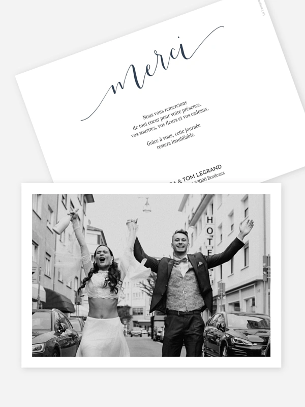 Exprimez toute votre gratitude avec la carte de remerciements "Danse d’amour", un modèle qui capture l'énergie et l'allégresse de votre union. Ce design moderne est une invitation à partager une dernière fois le bonheur de votre mariage avec vos proches à travers vos plus beaux souvenirs photographiques. Pour vous accompagner, nous vous proposons un service de création simple et intuitif ainsi qu'une livraison rapide de vos précieux courriers. Personnalisez dès maintenant votre lot en ligne pour envoyer un message aussi authentique que votre journée.