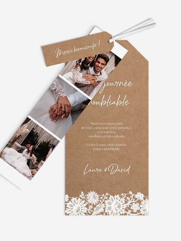 Ajoutez vos plus belles photos et dites merci à vos invités d'avoir rendu cette journée inoubliable avec la carte de remerciement "Dentelle boheme".