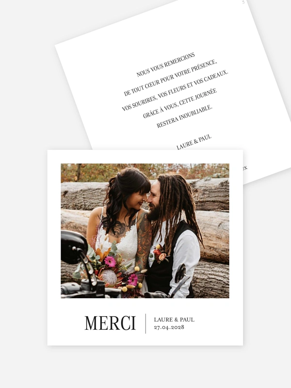Exprimez toute votre gratitude avec la carte de remerciement mariage "Fine élégance" qui met en lumière votre plus beau cliché de jeunes mariés. Son design épuré et moderne permet de remercier vos proches avec tendresse tout en prolongeant la magie de votre union.