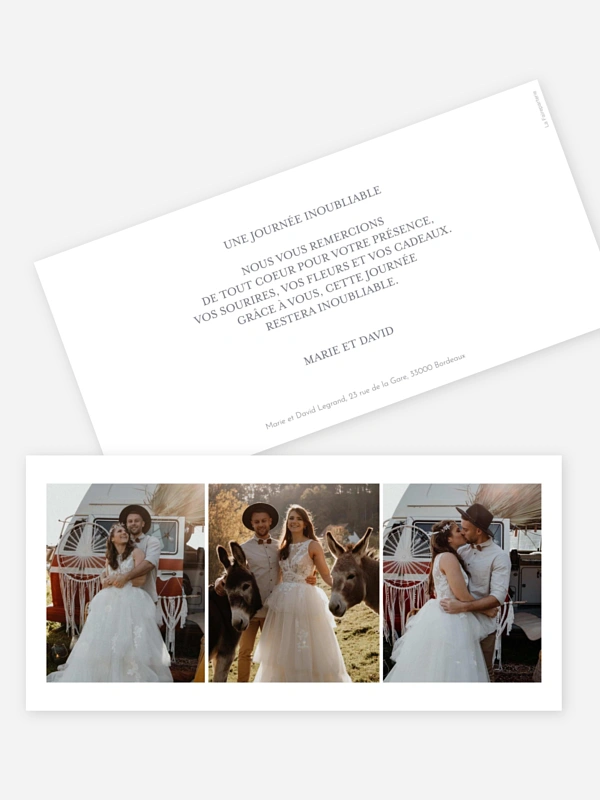 Partagez un souvenir mémorable de votre grand jour avec la carte de remerciement mariage "Horizon de douceur". Ce modèle au style cinématographique met magnifiquement en scène vos photos préférées pour exprimer votre gratitude avec émotion et authenticité.