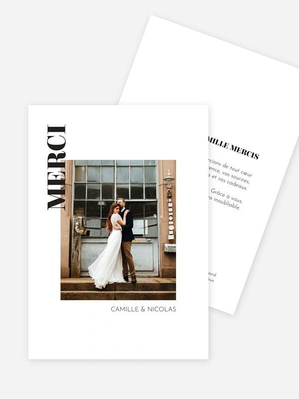 Remerciez vos proches avec toute l'élégance de votre grand jour grâce à la carte de remerciement mariage "Joie immense". Son design graphique et audacieux met en scène votre photographie préférée dans un cadre résolument moderne, parfait pour partager un dernier clin d'œil complice avec vos invités.