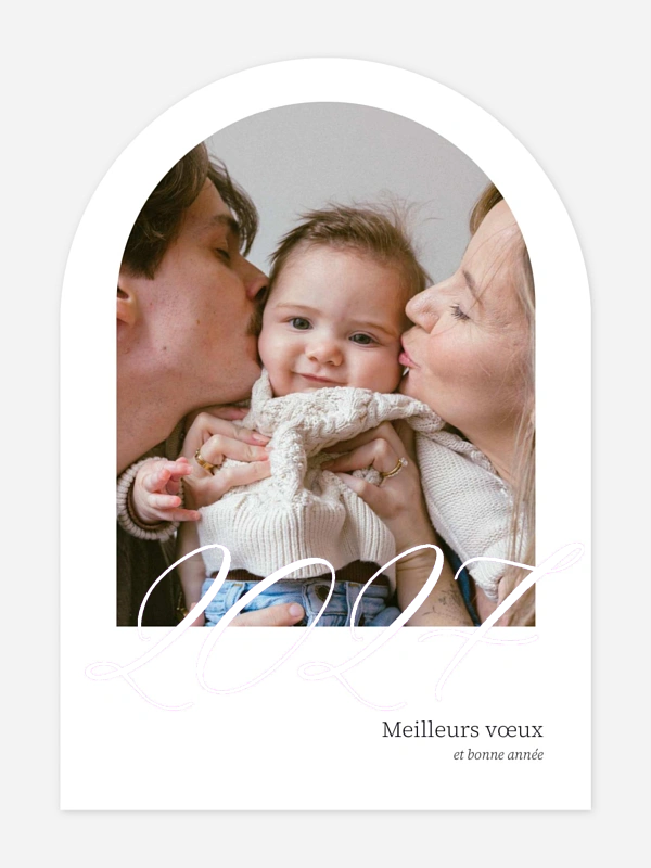Commencez l'année sous le signe de la tendresse avec la carte de vœux "Aube nouvelle", une création élégante qui sublime vos moments de complicité en famille. Ce design à la forme d'arche moderne et audacieuse met magnifiquement en lumière votre photo favorite pour envoyer un message de bonne année empreint de douceur et de joie.