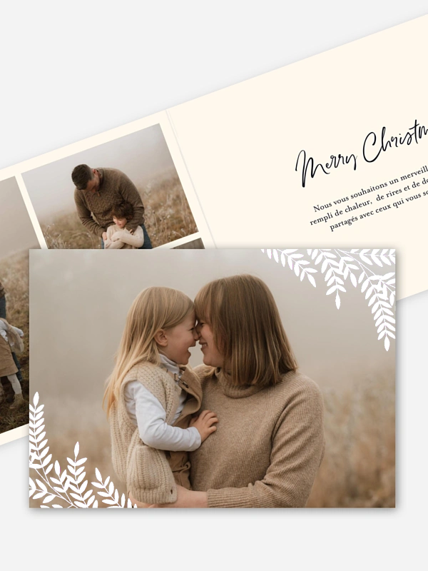 Partagez la magie des fêtes avec vos proches en leur envoyant la carte de vœux "Douce mélodie". Ce modèle à l'esprit naturel et chaleureux est idéal pour transmettre vos pensées les plus tendres et célébrer la fin de l'année en toute simplicité.