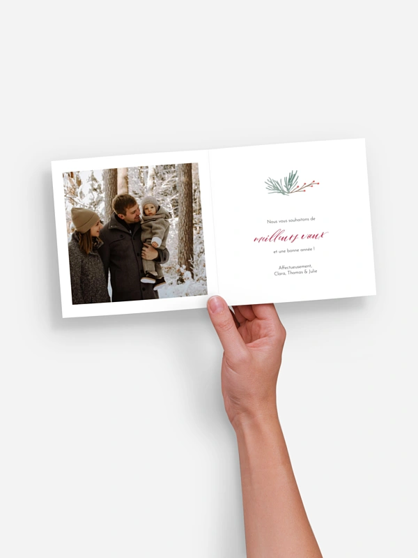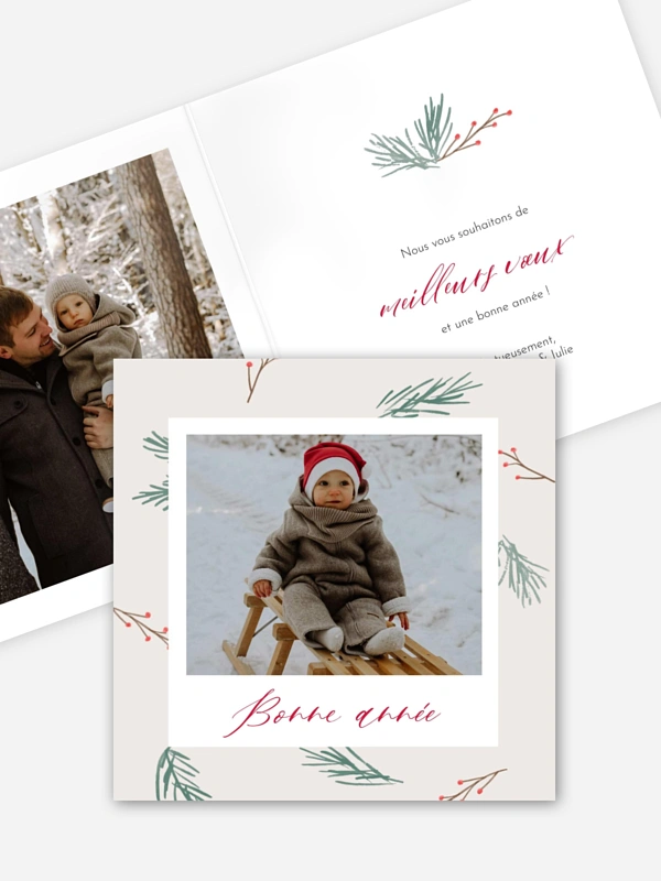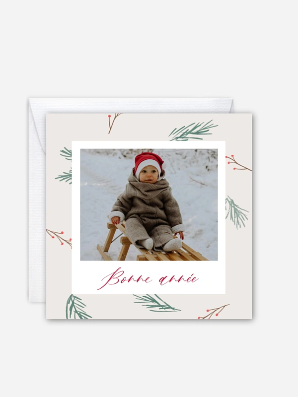 Envoyez un souffle de douceur à vos proches avec notre carte de voeux "Souffle d’hiver", idéale pour célébrer la nouvelle année avec tendresse. Ses illustrations délicates de branchages créent un écrin chaleureux autour de votre plus belle photo de famille pour partager vos meilleurs voeux. Pour vous assurer un résultat impeccable, profitez de notre service de retouche inclus et de notre impression de haute qualité sur des papiers d'exception. Personnalisez votre modèle en quelques clics et laissez la magie opérer.
