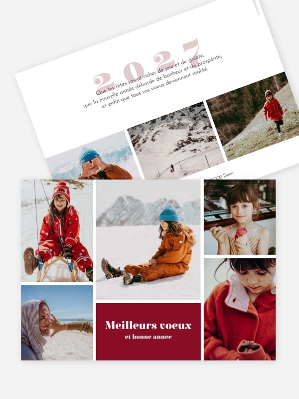 Partagez vos moments les plus précieux de l'année avec la carte de voeux "Souvenir d’union". Ce modèle en forme de pêle-mêle narratif permet de retracer vos plus beaux souvenirs, des sommets enneigés aux instants de tendresse en famille. C'est une attention chaleureuse pour envoyer vos voeux de fin d'année et renforcer les liens avec ceux qui vous sont chers. Pour un résultat à la hauteur de vos émotions, nous assurons une impression de haute qualité sur des papiers rigoureusement sélectionnés. Profitez de notre service de création simple et intuitif pour personnaliser votre envoi en quelques instants.
