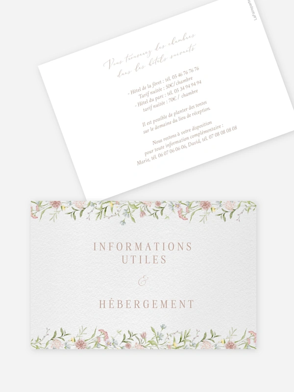 Personnalisez le carton information hébergement “From Lover to Forever” afin de fournir des informations utiles à vos invités, telles que les hôtels ou autres hébergements situés près de votre lieu de réception. Vos invités pourront ainsi s’organiser facilement avant le jour J pour pouvoir faire la fête avec vous jusqu’au petit matin.