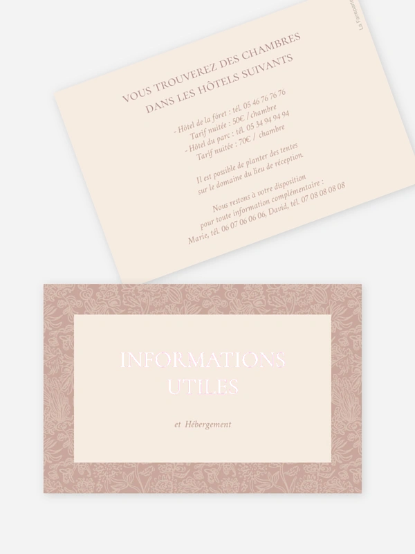 Personnalisez le carton information hébergement “Histoire d’amour” afin de fournir des informations utiles à vos invités, telles que les hôtels ou autres hébergements situés près de votre lieu de réception. Vos invités pourront ainsi s’organiser facilement avant le jour J pour pouvoir faire la fête avec vous jusqu’au petit matin.