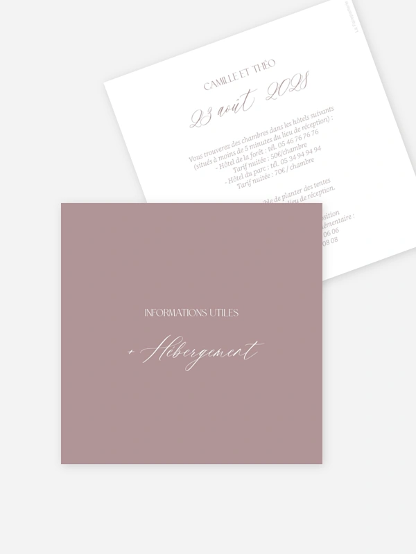 Personnalisez le carton information hébergement “Poème sur papier” afin de fournir des informations utiles à vos invités, telles que les hôtels ou autres hébergements situés près de votre lieu de réception. Vos invités pourront ainsi s’organiser facilement avant le jour J pour pouvoir faire la fête avec vous jusqu’au petit matin.