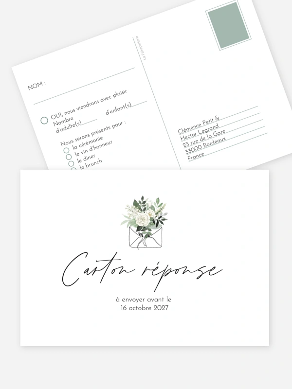 Ce carton réponse mariage "Escapade Greenery" est à glisser avec le faire-part. Vos invités pourront répondre de leur présence par ce carton réponse.