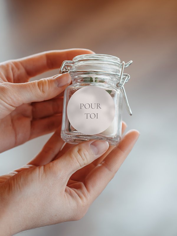 Personnalisez les stickers mariage "Komorebi Joy" avec vos noms et collez les étiquettes autocollantes sur vos cadeaux de mariage de vos invités.