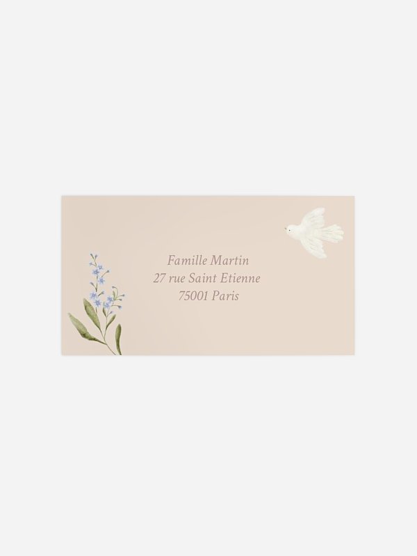 Personnalisez les étiquettes autocollantes adresses baptême "Colombe Fleurie" avec les adresses de vos invités puis collez-les sur vos enveloppes.