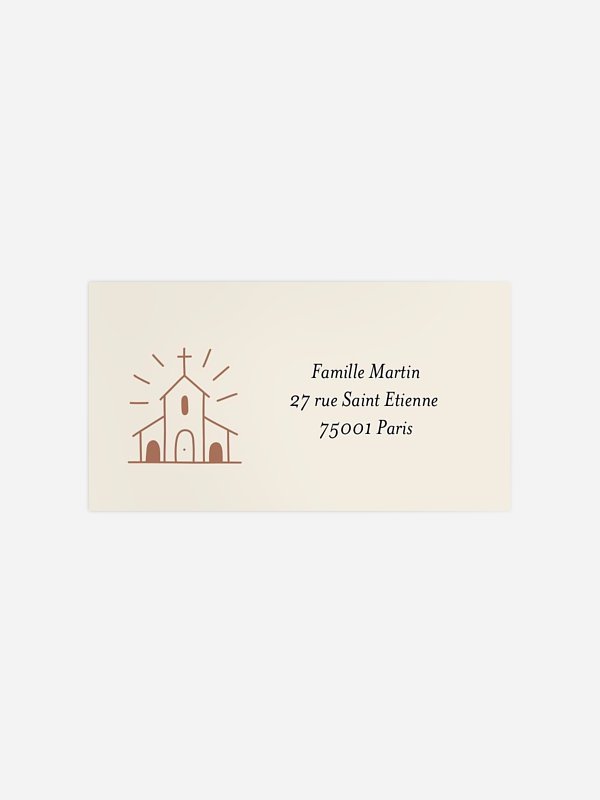 Personnalisez les étiquettes autocollantes adresses baptême "Petite église" avec les adresses de vos invités puis collez-les sur vos enveloppes.
