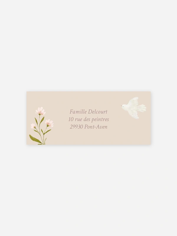 Personnalisez les étiquettes autocollantes baptême "Colombe Fleurie" avec votre adresse puis collez-les sur vos enveloppes.