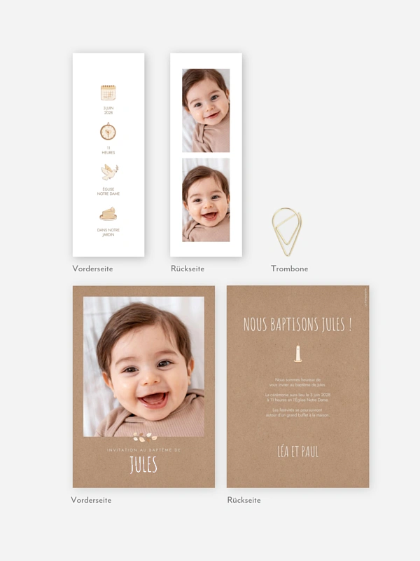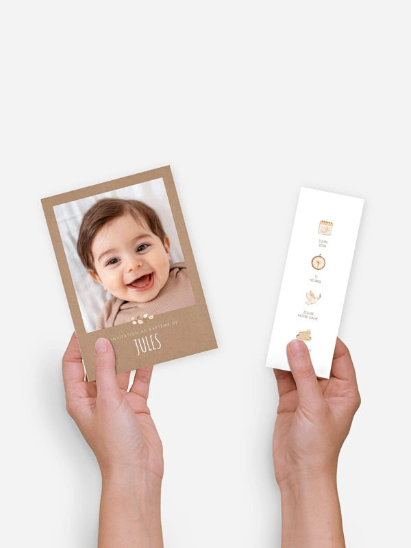 Le faire-part baptême "Baptême heureux" célèbre ce moment unique avec une douceur naturelle et une touche de tendresse. Son design épuré met en valeur la photo de votre enfant et annonce la cérémonie avec simplicité et émotion. Parfait pour partager cette belle étape de vie avec vos proches, il reflète tout l’amour et la joie de cette journée. Profitez de notre impression de haute qualité et de la configuration facile dans notre outil de création en ligne. Créez votre faire-part baptême "Baptême heureux" dès aujourd’hui et partagez votre bonheur en toute simplicité.