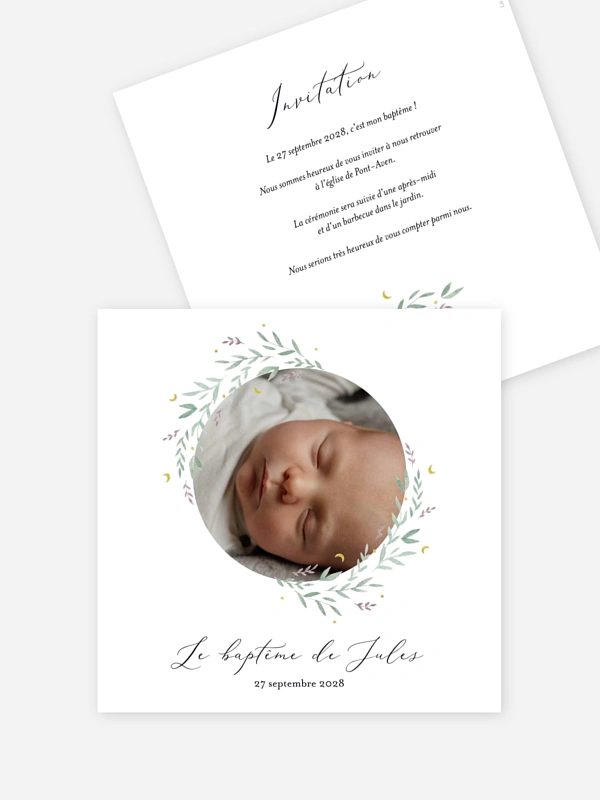 Invitez vos proches à célébrer un moment unique avec le faire-part baptême "Berceuse étoilée", dont l'arche végétale et les petites lunes apportent une atmosphère sereine à votre annonce. Ce design poétique met merveilleusement en valeur la photo de votre enfant pour convier votre entourage avec douceur et élégance.