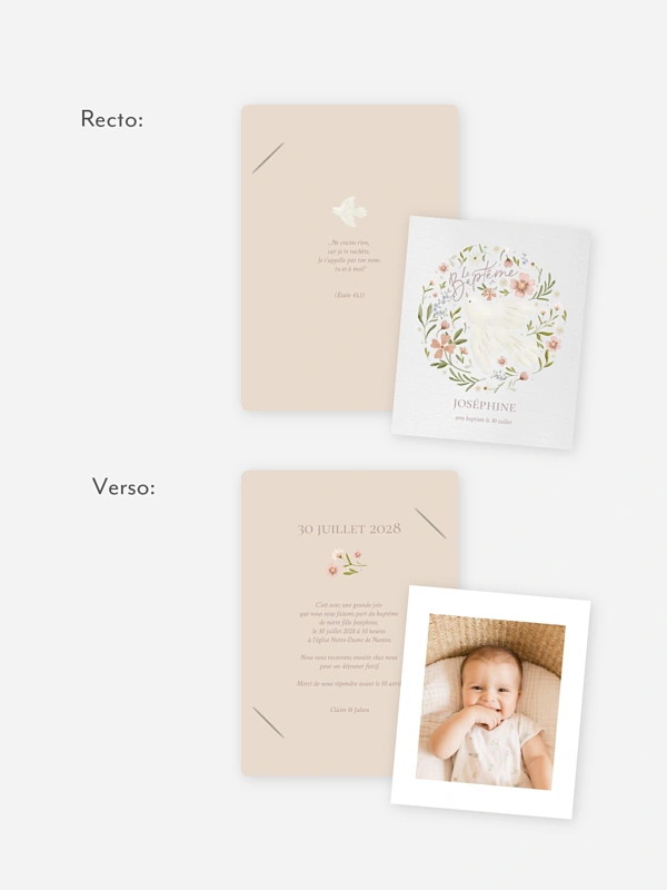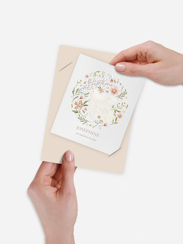 Personnalisez le faire-part baptême "Colombe Fleurie" pour inviter tous vos proches à la cérémonie de baptême de votre enfant.