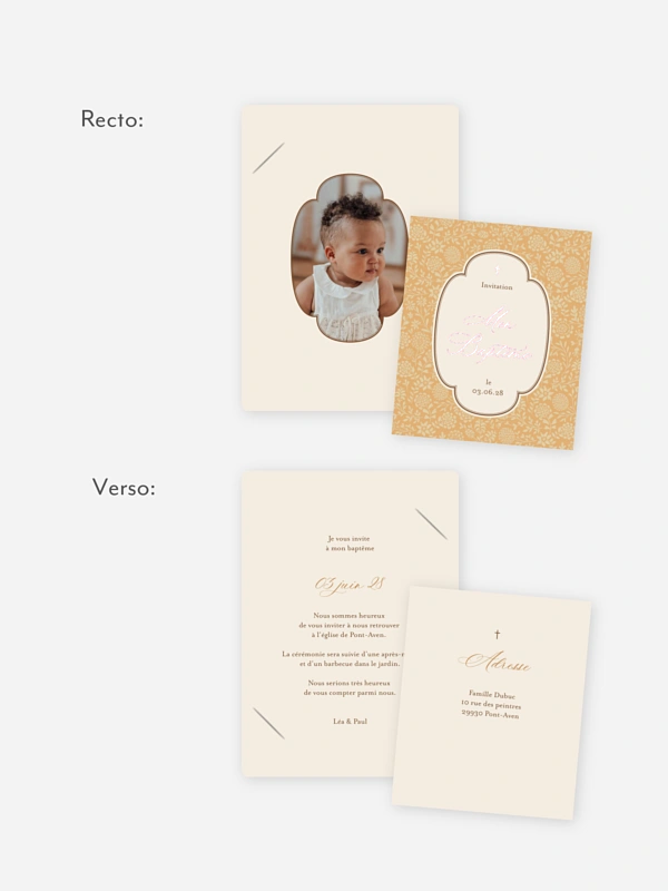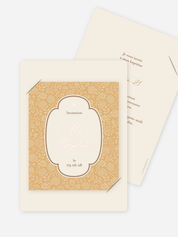 Le faire-part baptême "Petit herbier" annonce la cérémonie avec une poésie toute simple, comme une page d’album qu’on a hâte de partager. Son motif végétal délicat encadre votre invitation et met en valeur les informations essentielles, sans en faire trop. Idéal pour créer un faire-part de baptême plein de douceur, à compléter ensuite avec une carte de remerciement ou une petite étiquette assortie. Personnalisez votre texte facilement dans notre outil de création, puis profitez de nos papiers de qualité et d’une livraison rapide. Créez le vôtre en ligne dès maintenant.