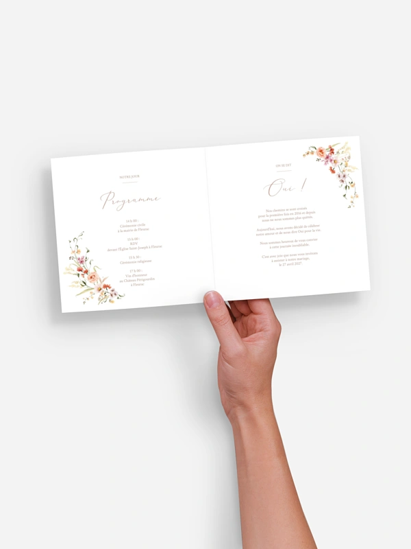- Pages intérieures : 1 double-page pour les marié.e.s, 2 doubles-pages différentes pour les invités.