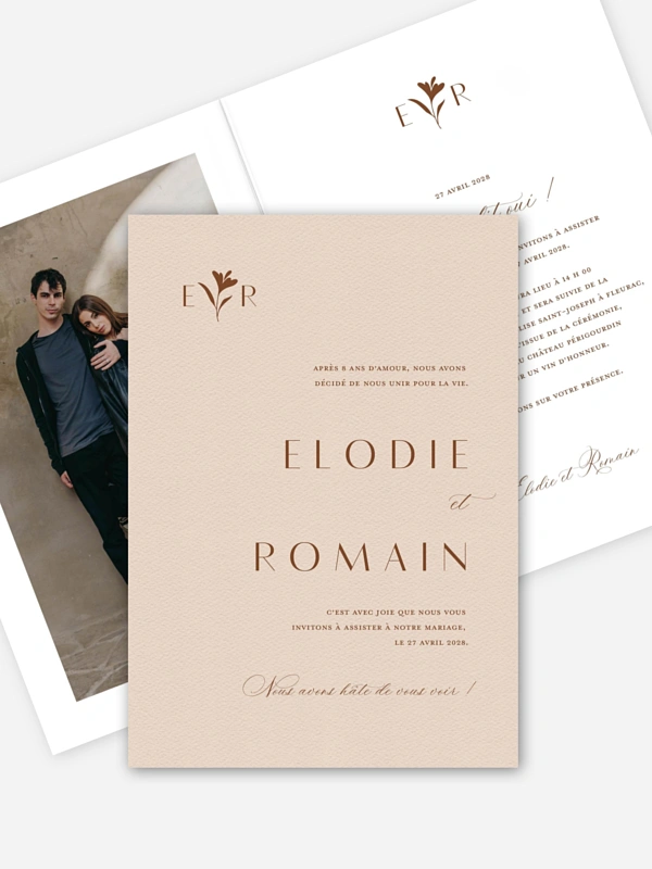 Une typographie raffinée, un monogramme délicat, et l’émotion d’un moment inoubliable : le faire-part de mariage "Élégant Monogramme" célèbre votre union avec élégance et simplicité. Chaque détail de ce design respire l’amour partagé et le désir de rassembler vos proches pour ce jour unique. Ce faire-part est idéal pour créer une invitation de mariage qui vous ressemble, tout en affirmant votre sens du style. Imprimé sur des papiers haut de gamme et livré rapidement, il se personnalise en quelques clics avec notre service de création facile.