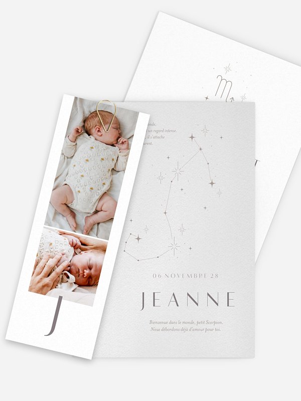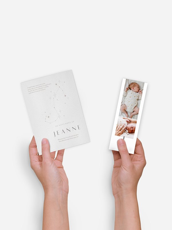 Avec le faire-part de naissance "Constellation du Scorpion", vous annoncez l’arrivée de votre bébé d’une manière aussi symbolique qu’émouvante. Le design délicat et son motif astrologique créent un joli lien entre ciel et cœur – pour une nouvelle empreinte de douceur à partager. Profitez de notre service d’impression de haute qualité et recevez gratuitement un échantillon chez vous.