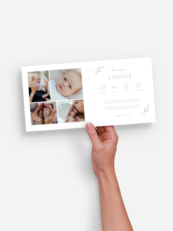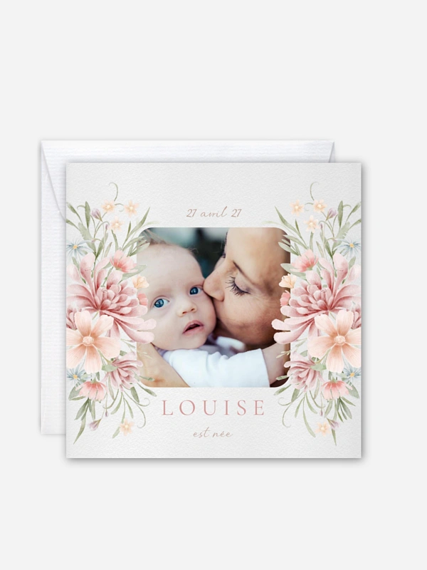 Entouré de fleurs tendres, le faire-part de naissance "Enfant de la Rose" annonce la venue de votre bébé avec poésie et délicatesse. Chaque détail évoque la douceur des premiers instants partagés. Un choix plein d’émotion pour faire rayonner cette belle nouvelle auprès de vos proches. Disponible en échantillon gratuit, et imprimé sur des papiers soigneusement sélectionnés.