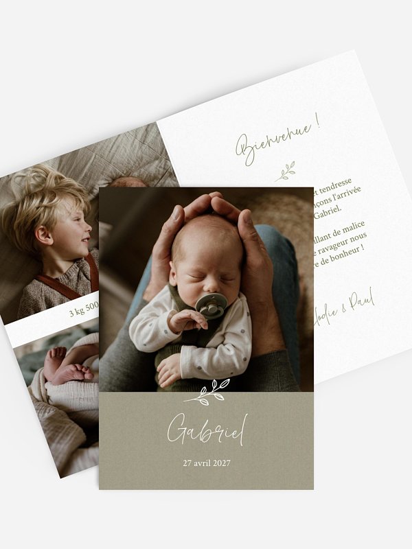 Une jolie carte naissance à personnaliser avec les photos de votre bébé. Doux et classique, le faire-part de naissance "Feuille dorée" vous enchantera.