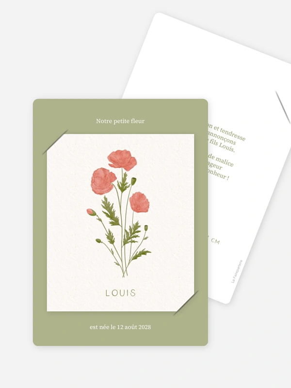Tendre clin d’œil au mois de naissance, la carte "Fleur de naissance - août" met à l’honneur le coquelicot. Ce faire-part de naissance tout en délicatesse accompagne l’arrivée de votre enfant avec douceur et poésie. L’illustration florale crée un lien personnel et intemporel, comme une promesse de beauté partagée. Imprimée avec soin sur des papiers de haute qualité, elle vous permet d’annoncer ce moment précieux avec style et cœur. Un échantillon gratuit vous attend pour découvrir le rendu chez vous.