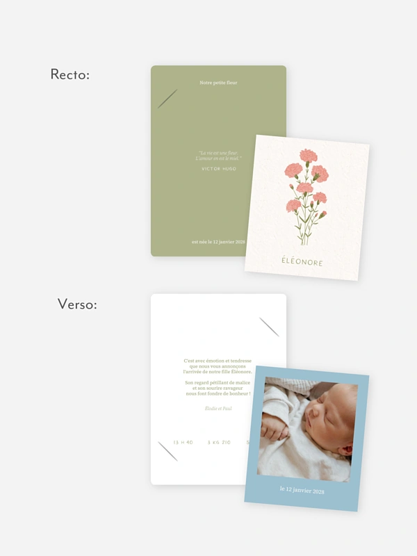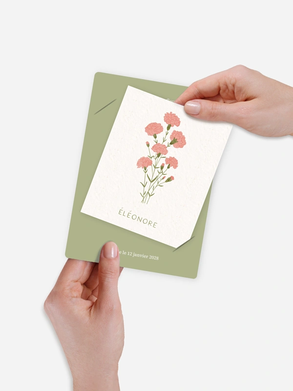 Tendre clin d’œil au mois de naissance, la carte "Fleur de naissance - janvier" met à l’honneur l’œillet. Ce faire-part de naissance tout en délicatesse accompagne l’arrivée de votre enfant avec douceur et poésie. L’illustration florale crée un lien personnel et intemporel, comme une promesse de beauté partagée. Imprimée avec soin sur des papiers de haute qualité, elle vous permet d’annoncer ce moment précieux avec style et cœur. Un échantillon gratuit vous attend pour découvrir le rendu chez vous.