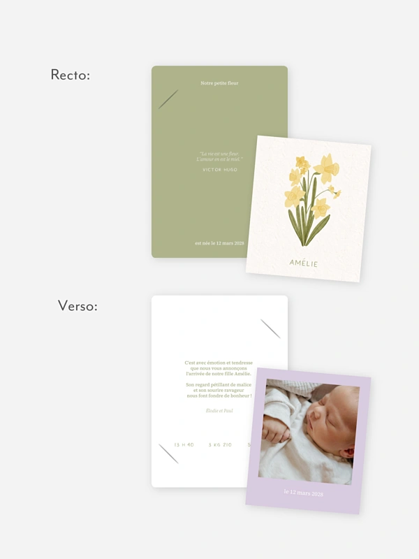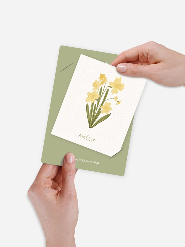 Tendre clin d’œil au mois de naissance, la carte "Fleur de naissance - mars" met à l’honneur la joncquille. Ce faire-part de naissance tout en délicatesse accompagne l’arrivée de votre enfant avec douceur et poésie. L’illustration florale crée un lien personnel et intemporel, comme une promesse de beauté partagée. Imprimée avec soin sur des papiers de haute qualité, elle vous permet d’annoncer ce moment précieux avec style et cœur. Un échantillon gratuit vous attend pour découvrir le rendu chez vous.