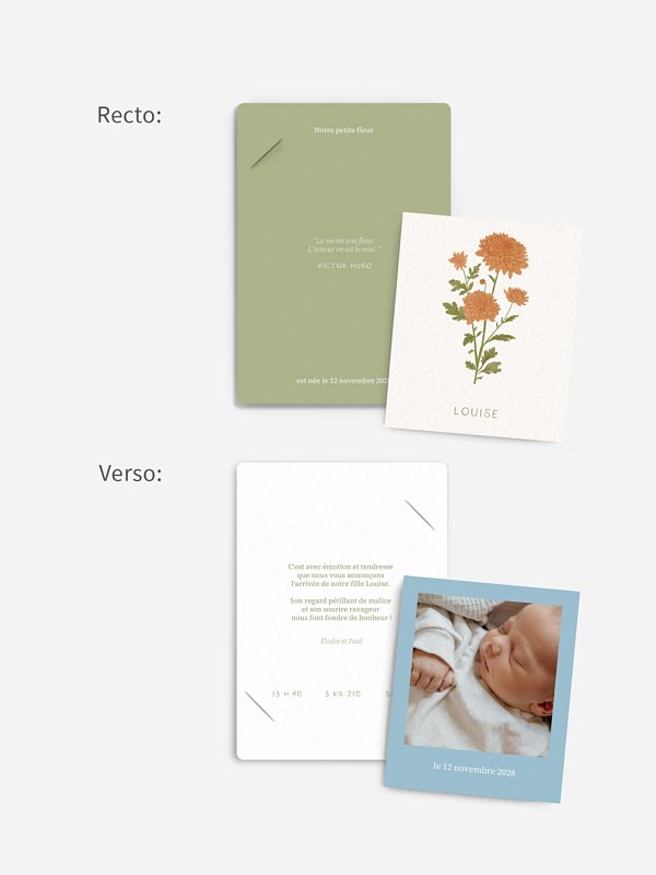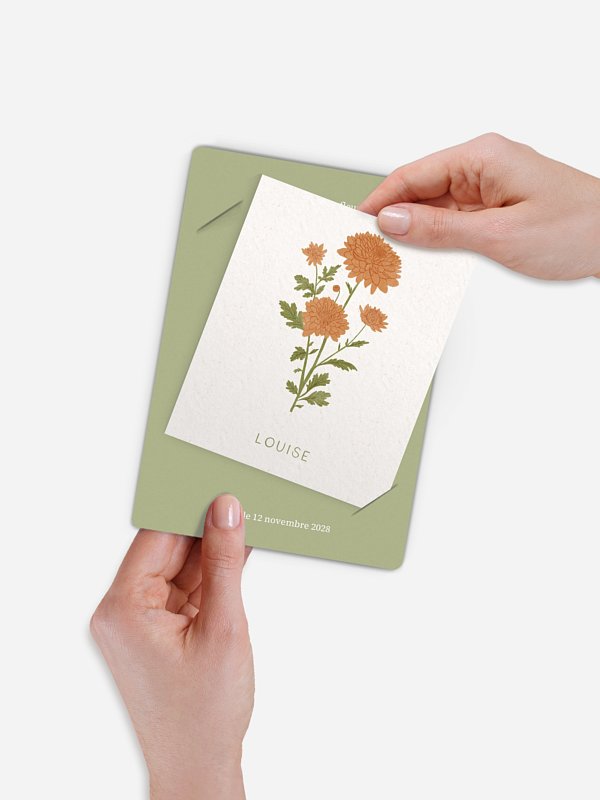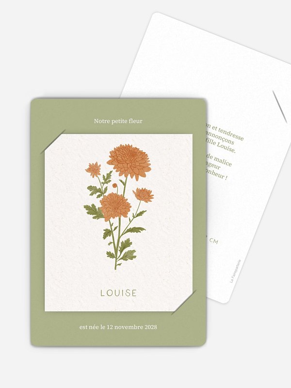 Tendre clin d’œil au mois de naissance, la carte "Fleur de naissance - novembre" met à l’honneur le chrysanthème. Ce faire-part de naissance tout en délicatesse accompagne l’arrivée de votre enfant avec douceur et poésie. L’illustration florale crée un lien personnel et intemporel, comme une promesse de beauté partagée. Imprimée avec soin sur des papiers de haute qualité, elle vous permet d’annoncer ce moment précieux avec style et cœur. Un échantillon gratuit vous attend pour découvrir le rendu chez vous.