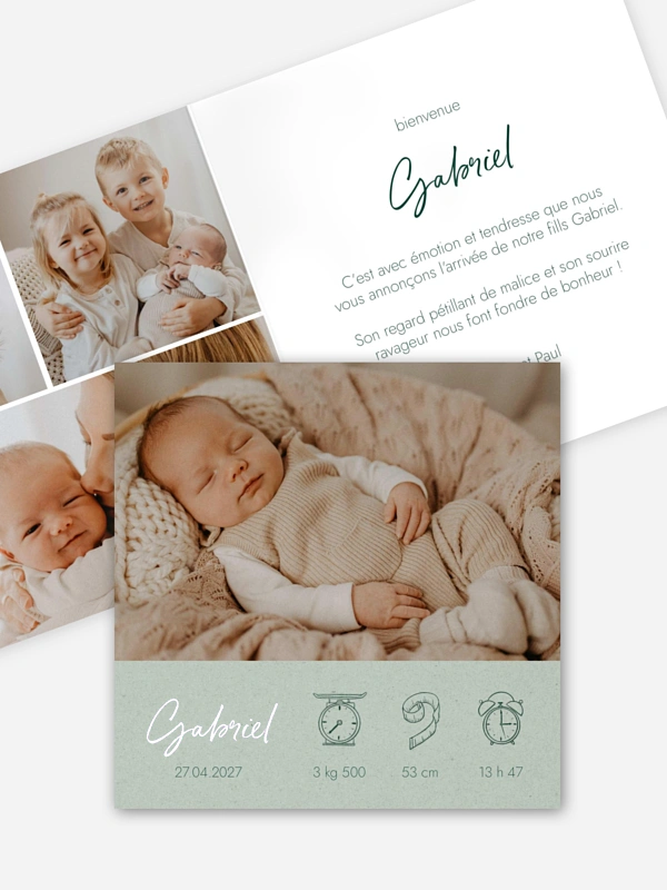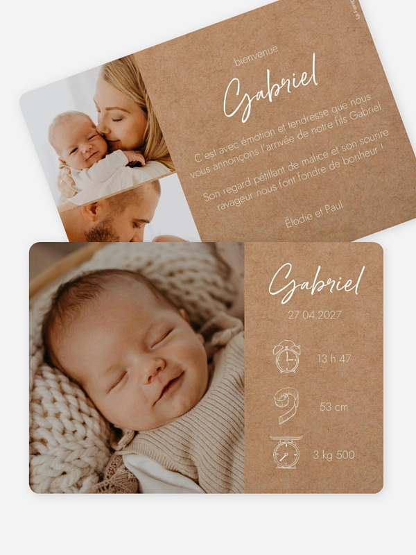 Une jolie carte naissance à personnaliser avec les photos de votre bébé. Doux et classique, le faire-part de naissance "Natural Picto" vous enchantera.