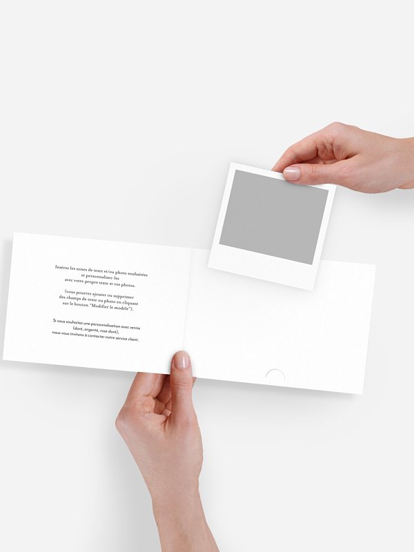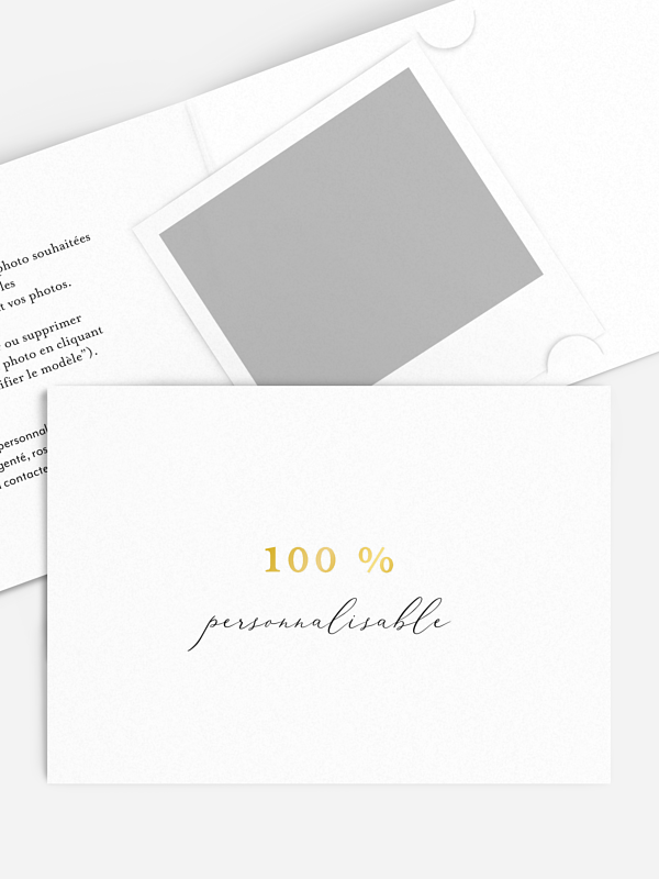 Carte 100% personnalisable. Choisissez le format que vous préférez puis insérez les zones de texte et/ou photo souhaitées. Personnalisez-les avec votre propre texte et vos photos (vous pourrez ajouter ou supprimer des champs de texte ou photo en cliquant sur le bouton “Modifier le modèle”). Si vous souhaitez une personnalisation avec vernis (doré, argenté, cuivré, rose doré), nous vous invitons à contacter notre service client avant la réalisation de votre commande afin de valider la faisabilité de votre projet. De plus un coût supplémentaire pourra vous être demandé.