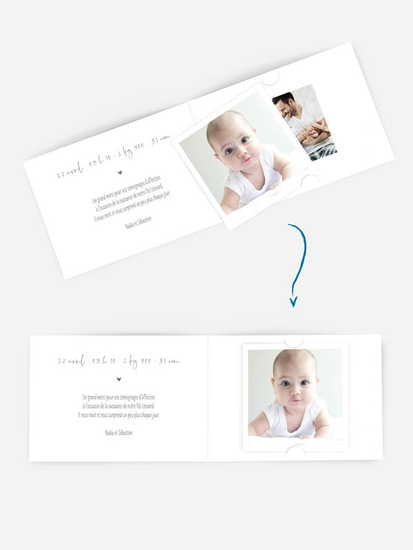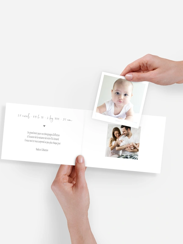 Une jolie carte naissance à personnaliser avec les photos de votre bébé. Douce et classique, le faire-part de naissance "Photos du bonheur" vous enchantera.