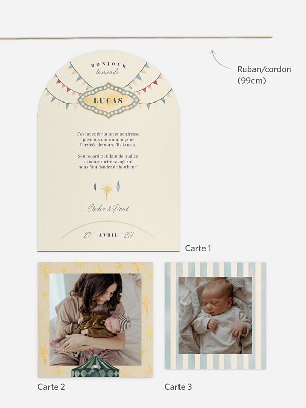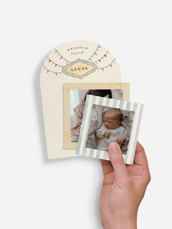 Avec son esprit joyeusement rétro et ses petits fanions festifs, le faire-part de naissance "Place au spectacle" annonce l’arrivée de votre bébé comme un joli moment de magie. La mise en scène délicate de la photo fait de cette carte un souvenir à chérir, à mi-chemin entre douceur et petit clin d’œil de cirque. Une belle façon de partager votre bonheur avec vos proches, tout en les invitant à découvrir ce nouveau chapitre de votre vie. Imprimé sur des papiers de qualité, avec une livraison rapide et simple, ce faire-part est aussi agréable à créer qu’à recevoir. Créez votre lot en ligne dès maintenant.