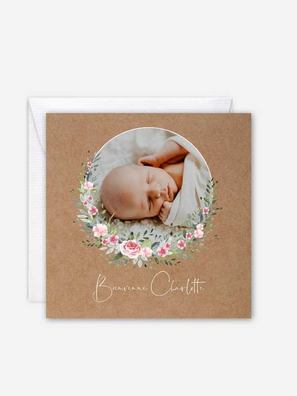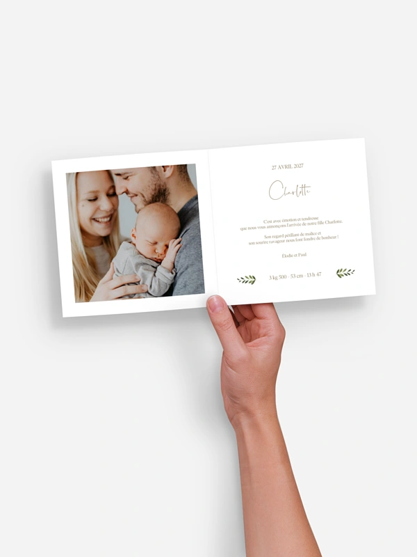 Une jolie carte naissance à personnaliser avec les photos de votre bébé. Doux et classique, le faire-part de naissance "Portrait romantique" ravira vos proches.