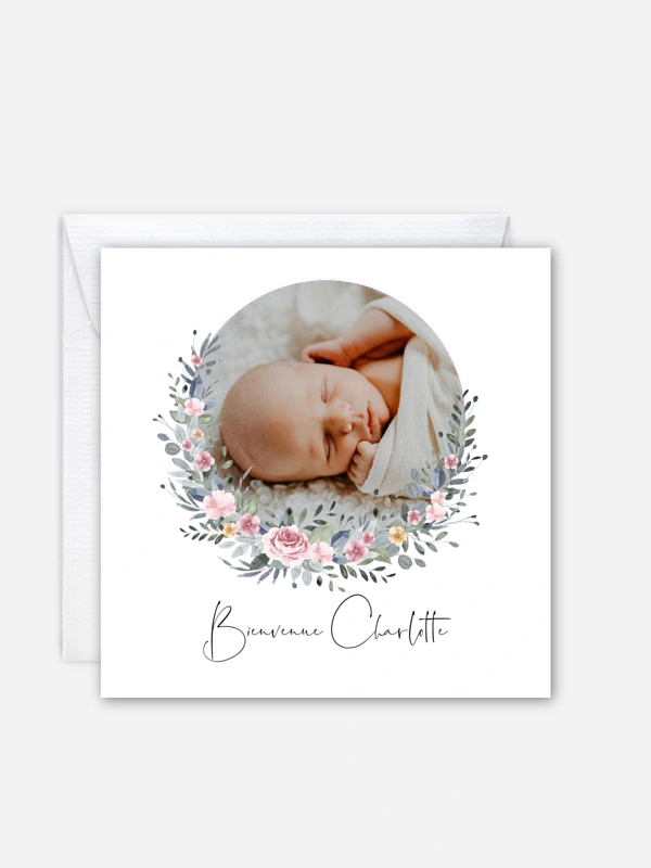 Une jolie carte naissance à personnaliser avec les photos de votre bébé. Doux et classique, le faire-part de naissance "Portrait romantique" ravira vos proches.