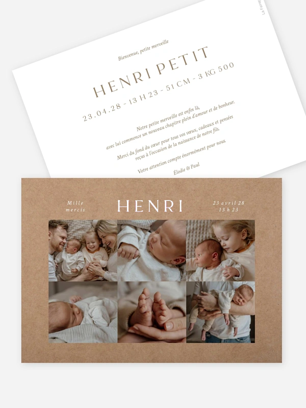 Le faire-part de naissance "Tout notre bonheur" réunit vos plus tendres souvenirs dans une mise en page chaleureuse et vivante. Chaque photo devient une déclaration d’amour, chaque mot une invitation à partager cette joie immense. Un design qui célèbre la naissance avec authenticité – tout en douceur et en émotions.