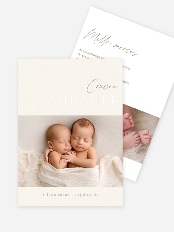 Tendres comme un premier câlin, les jumeaux s’invitent dans votre vie – et dans vos cartes – avec le faire-part de naissance "Premier coucou". Son design épuré met en valeur l’émotion du moment et la douceur de vos bébés blottis l’un contre l’autre. Une façon simple et sincère de dire “Bienvenue” à deux petits miracles. Profitez de notre impression haut de gamme et commandez votre échantillon gratuit pour choisir en toute sérénité.
